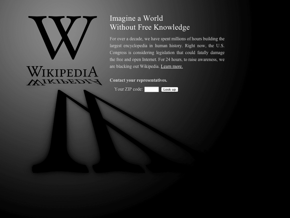 Wikipedia blacked itself out on Wednesday in an effort to educate users about the Stop Online Piracy and Protect IP acts. (Screenshot from en.wikipedia.org.)