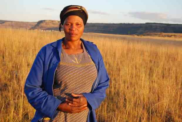 Thombi Mavihlombe stands in the wild grass beside her farm. (Photo by Anders Kelto.)