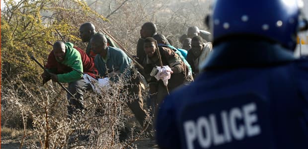 A policeman fires at protesting miners outside a South African mine in Rustenburg. (Photo: Siphiwe Sibeko/REUTERS)