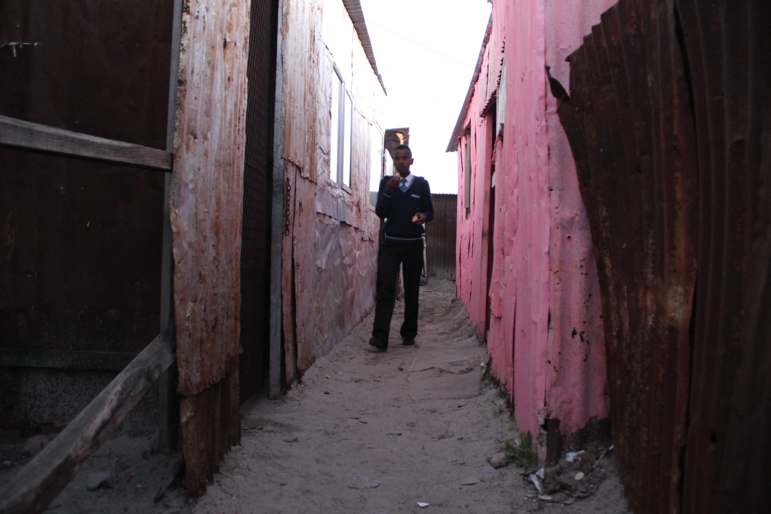 His neighborhood is a vast area of shacks and dirt roads, with stray dogs wandering past. It’s the kind of place many would feel unsafe, but Lukhanyo feels the opposite.