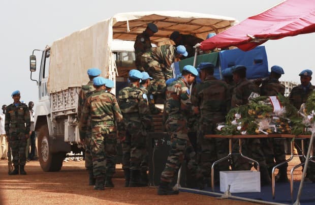 United Nations peacekeepers unload coffins of five United Nations peacekeepers killed in Jonglei from a truck, at Juba airport April 10, 2013. Five United Nations peacekeepers and seven civilian staff were killed on Tuesday by unidentified attackers in the restive eastern state of Jonglei. REUTERS/Andreea Campeanu (SOUTH SUDAN – Tags: CIVIL UNREST) – RTXYGIS