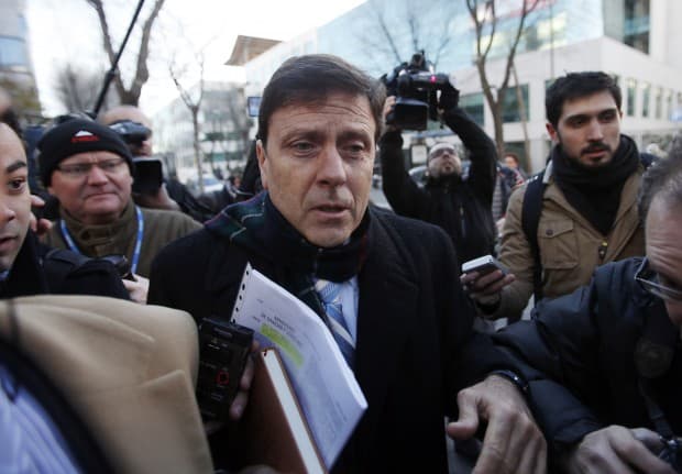 Spanish doctor Eufemiano Fuentes (C) is surrounded by media as he enters a courthouse on the first day of the high-profile Operacion Puerto doping trial in Madrid, January 28, 2013. The trial of Fuentes and others accused for their involvement in a doping ring in professional cycling began on Monday, nearly seven years after Spanish police seized anabolic steroids, transfusion equipment and blood bags as part of a probe which was code-named Operacion Puerto. REUTERS/Sergio Perez (SPAIN – Tags: CRIME LAW SPORT CYCLING) – RTR3D30P