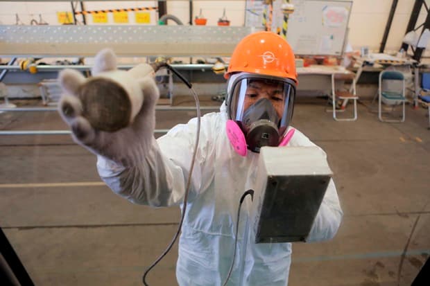 A worker checks radiation levels on a bus at the Fukushima Daiichi nuclear plant. Precautions in the region against radiation are still widespread, despite uncertainty over the risks. (PHOTO: REUTERS/Itsuo Inouye/Pool)