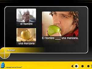 In a tutorial, Rosetta Stone’s software program teaching Spanish starts by introducing some simple vocabulary. Colorful photos pop up on the screen and users are supposed to match the picture with the spoken word. The program also has users repeat words into a microphone to practice pronunciation. In a matter of minutes users are stringing together very basic sentences.