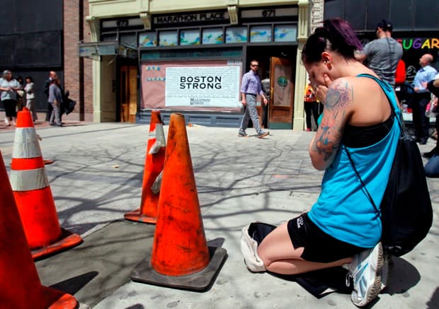 Hillary Branyik, 22, of Boston kneels at the site of the first explosion on Boylston Street, Boston. (Photo: REUTERS/Jessica Rinaldi)