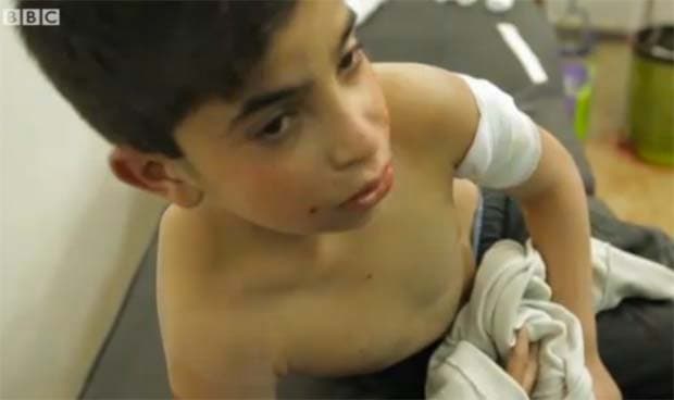 An injured boy receiving treatment in Homs. (Photo: BBC)