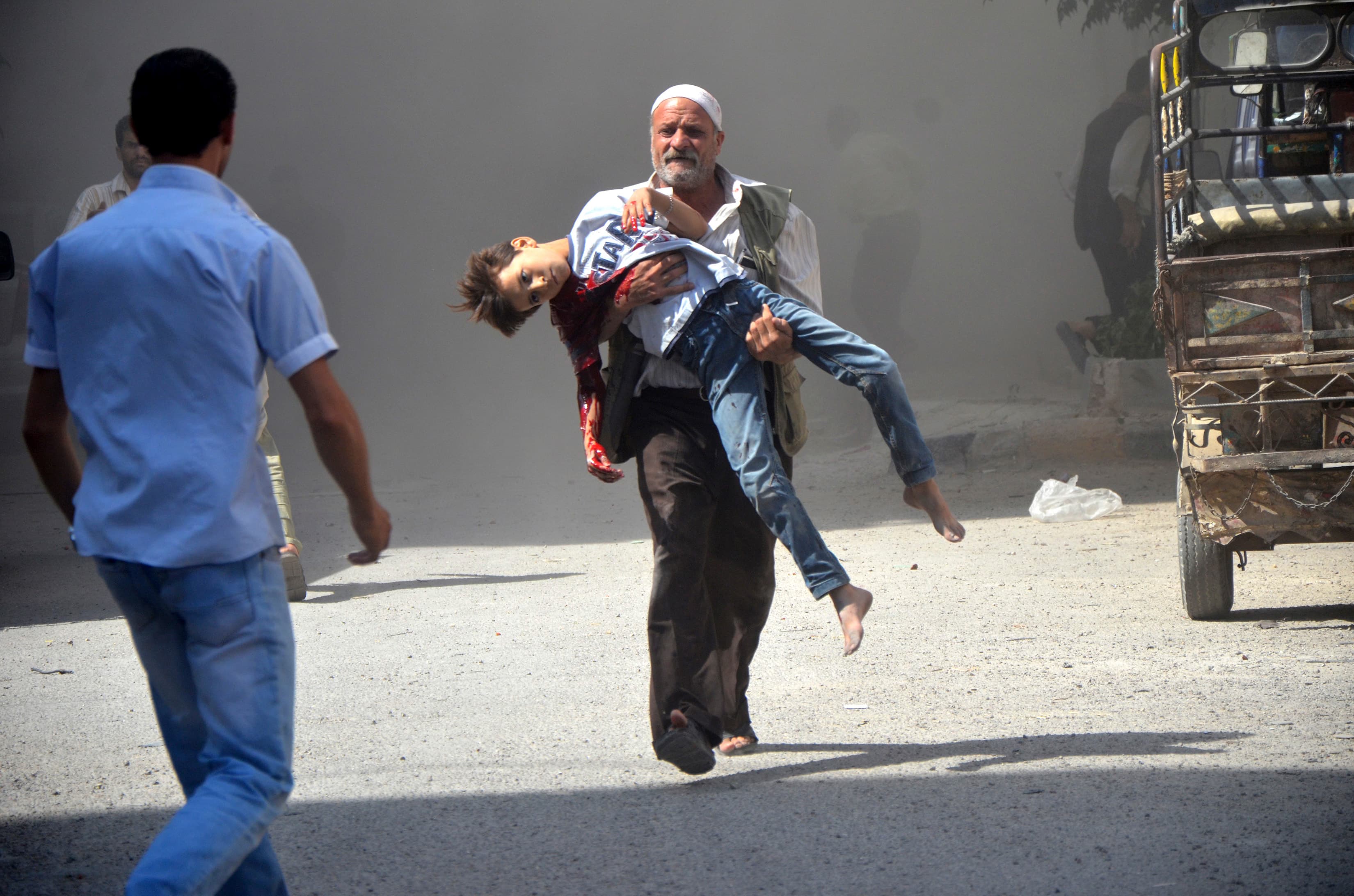 A man carries a boy wounded in what the Free Syrian Army said was an air raid by forces loyal to Syrian President Bashar al-Assad in the Duma district area near Damascus July 13, 2013. The air raid on July 13 was part of al-Assad’s campaign to secure the Duma area from rebels, according to the Free Syrian Army. Picture taken July 13. REUTERS/Bassam Khabieh (SYRIA – Tags: CONFLICT CIVIL UNREST POLITICS) TEMPLATE OUT – RTX11ONN