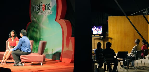 A flimsy stage wall is all that divides Moung Ramary and the father she has never met (second from right) as she talks with the host on stage. (Photo: Brendan Brady)