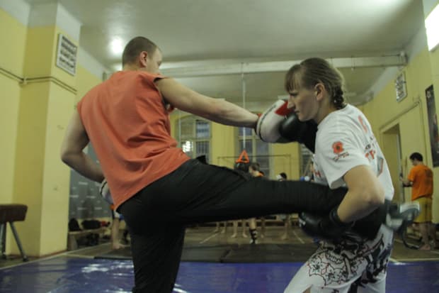 Tarnovska is training in kickboxing and Muay Thai. She spars with her trainer in preparation for an upcoming match.