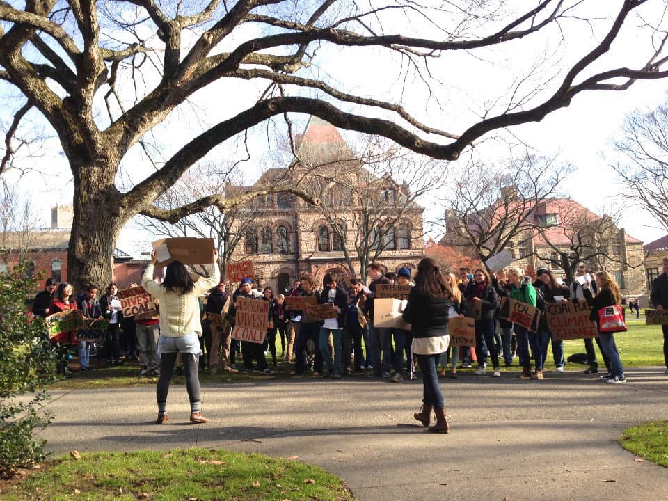 Student activists rally on Brown’s campus, demanding the school divest its endowment from fossil fuel companies. (Photo courtesy of Brown Divest Coal Campaign.)