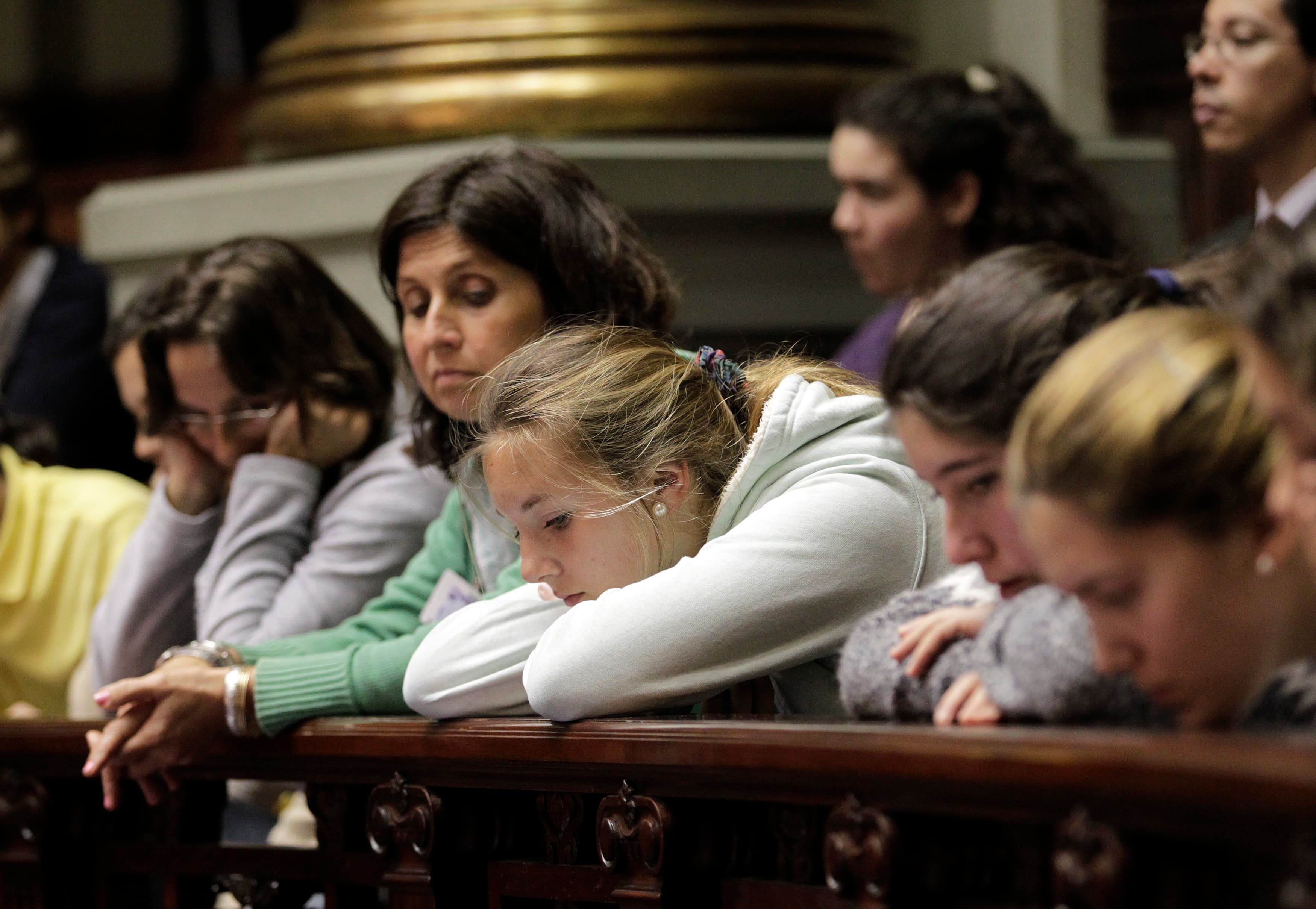 People look on as Uruguayan senators debate a bill to legalize abortion in Montevideo October 17, 2012. Senators voted 17 to 14 in favor of a bill to legalize abortions during the first 12 weeks of pregnancy, a rare move in largely Catholic Latin America that underscores the country’s liberal leanings. REUTERS/Andres Stapff (URUGUAY – Tags: POLITICS HEALTH SOCIETY)