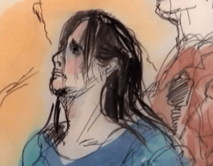Harry Burkhart, pictured in a court sketch, faces 37 counts of arson, stemming from the New Year’s weekend fires in Los Angeles. (Photo from AP video.)