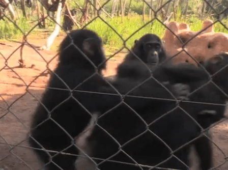 A group of young chimpanzees are being raised at the J.A.C.K. sanctuary in the Democratic Republic of the Congo. (Photo from Global Post video.)
