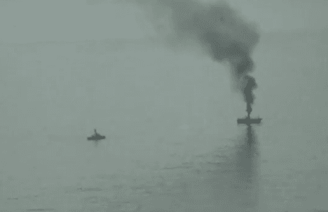A Ryon-Un Maru smokes after being barraged by cannon fire from a U.S. Coast Guard cutter on Thursday. It was sunk to prevent it from endangering other ships. (Photo from U.S. Coast Guard video via AP.)