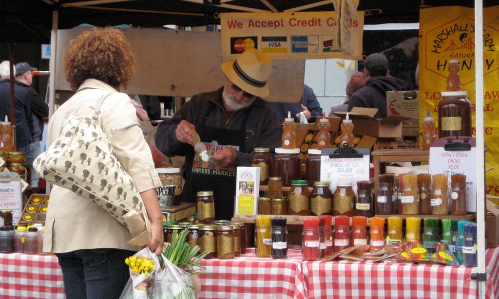 Honey stall at the Farmer’s Market, Ferry Building in San Francisco in 2008. Pollen experts say the only way to make sure you’re getting actual honey is to buy from local farmers or at local stores. (Photo by Flickr user Phillie Casablanca, cc-b