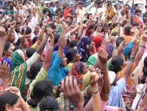Women hold their hands up during Women’s Day in India. (flickr user Joe Athialy (cc:by-nc))