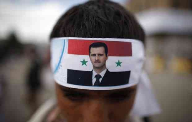 A protester wears a headband with a picture of Syria’s President Bashar al-Assad. (Photo by Khaled Abdullah/Reuters.)