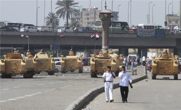 Egyptian army soldiers guard with armoured personnel carriers (APC) near Tahrir Square in Cairo August 19, 2013. Suspected Islamist militants killed at least 24 Egyptian policemen on Monday in the Sinai peninsula, where attacks on security forces have multiplied since the army overthrew President Mohamed Mursi on July 3. REUTERS/Mohamed Abd El Ghany (EGYPT – Tags: POLITICS CIVIL UNREST) – RTX12QTP