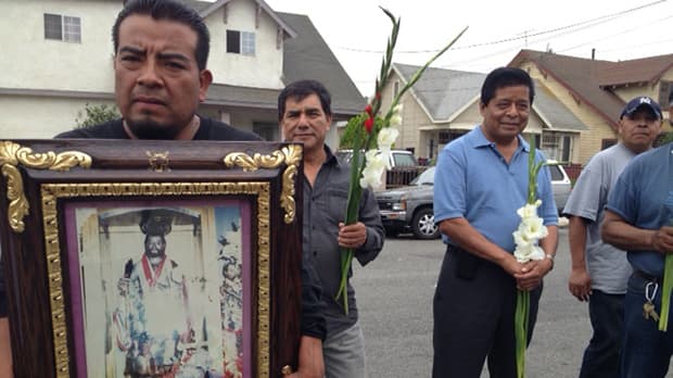 On a warm Sunday afternoon, Romero and more than 50 other Zoogochenses stand outside a home in South LA, holding red gladiolus flowers. They wait for the brass band to start playing. Then, they march behind a framed 8-by-11 photo of an effigy of their patron saint, San Bartolome. The photo is taken inside a home and placed on an altar, surrounded by incense and more flowers. The display is similar to the type of ritual done back in the Mexican village, with the original effigy.
