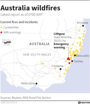 Roughly 60 blazes are still raging near Sydney, Australia, as the region enters its second week of intense wildfires.