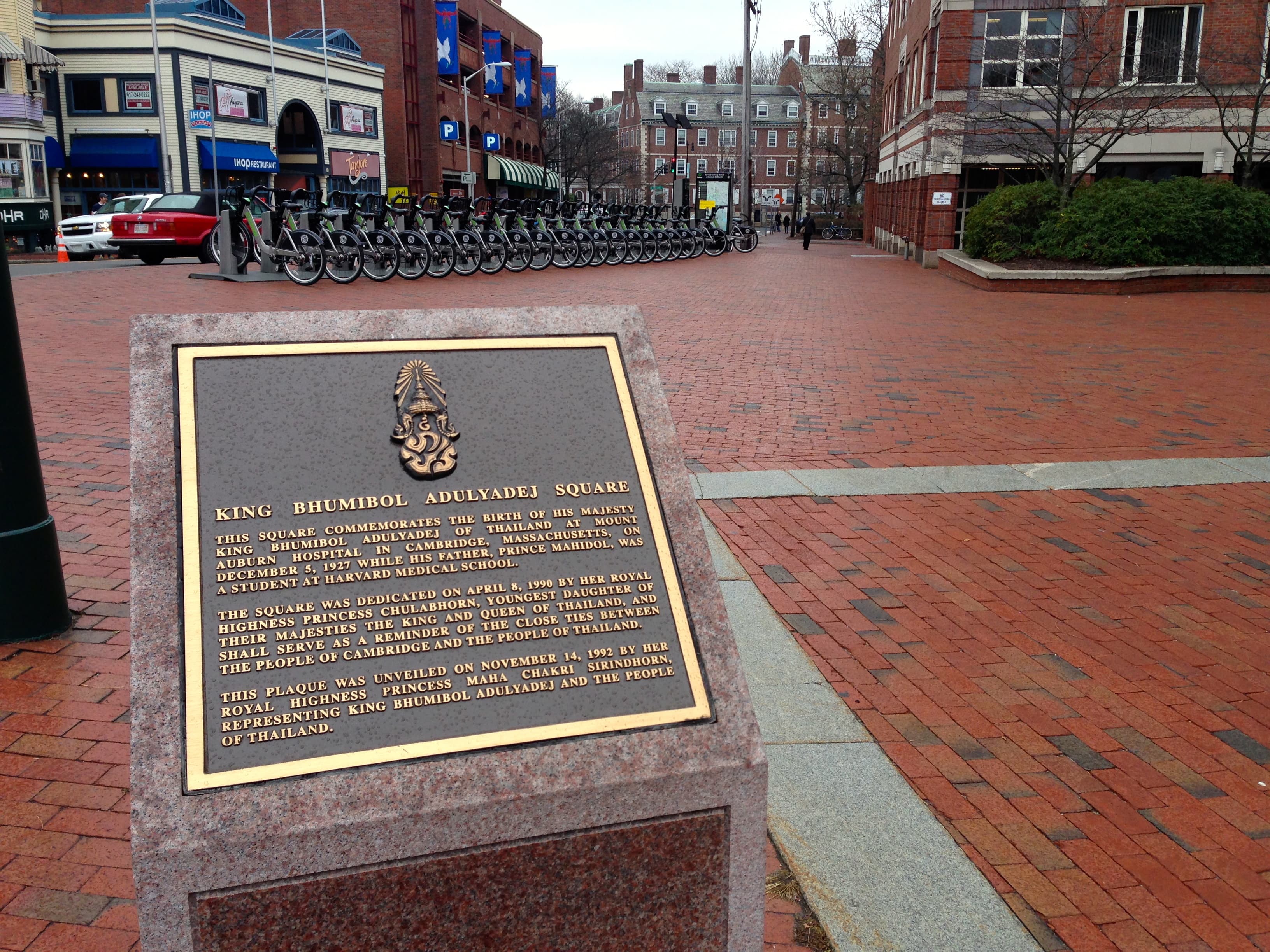King Bhumipol spent the first two years of his life in the Boston area. There are plaques displayed at his former residence in Brookline, at Mount Auburn Hospital and another one in Harvard Square.