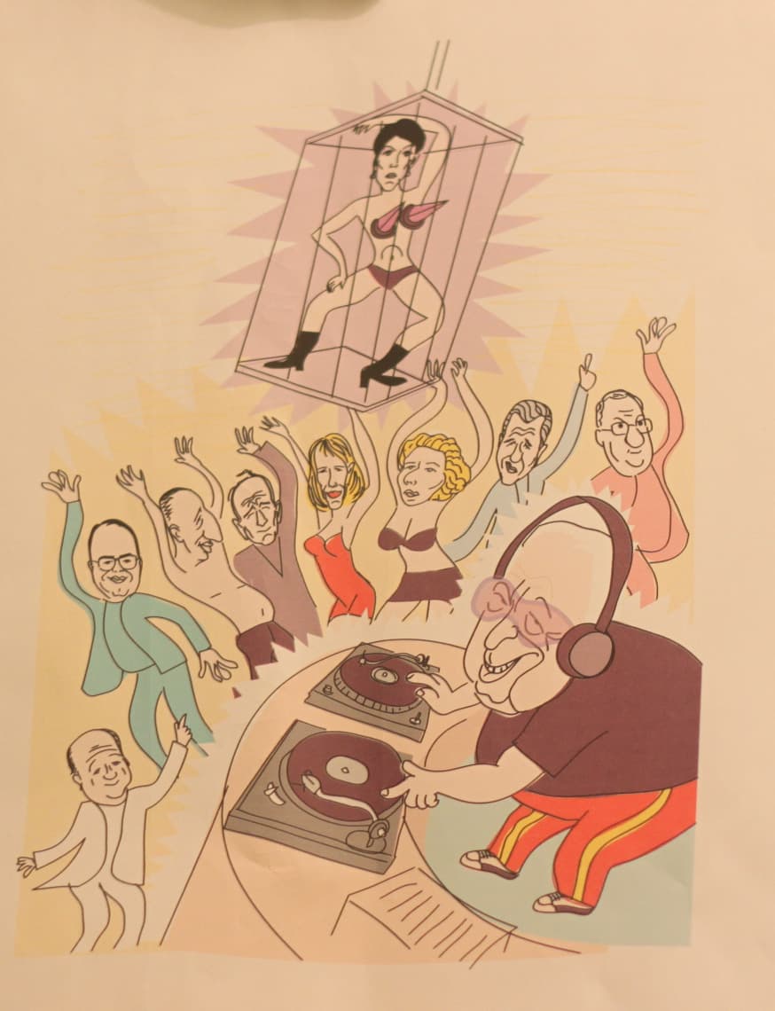 Biderman is a caricaturist for Israel’s leading liberal daily, Haaretz. One of his earlier caricatures of Sharon was when he was elected prime minister in 2001. It’s a drawing satirizing Sharon’s victory in the election. Sharon is a DJ at a party, with all the Likud members dancing.