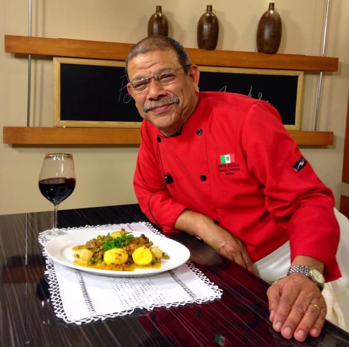 Reporter Betto Arcos describes watching local chef Pepe Ochoa prepare to make the dish. "Pepe's about to start making the filling for the chiles, putting the onion in olive oil. So he's throwing in some bay leaf into the onion as its being sauteed."