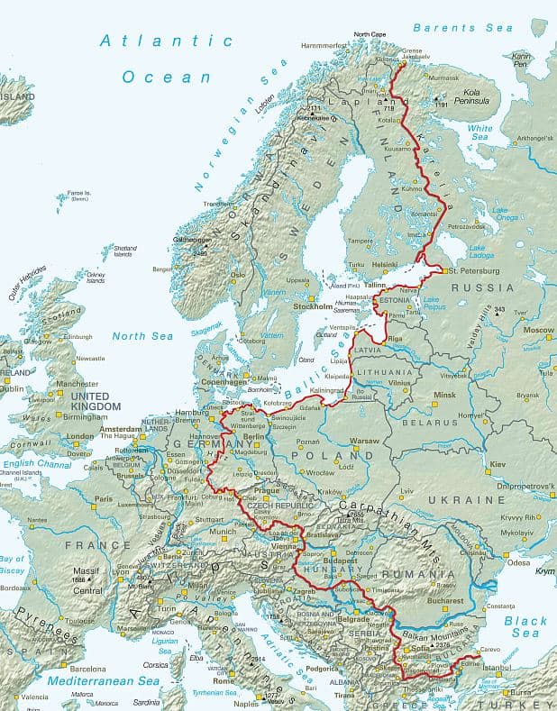 After that, the trail follows the highlands of the Bohemian Forest, passes Moravia and the Slovak capital of Bratislava, and crosses the Danube near Vienna. It then follows the southern border of Hungary via Slovenia and Croatia. Between Romania and Serbia it mostly follows the Danube, and, finally, via Bulgaria, Macedonia and Greece, it ends at the northernmost point of Turkey on the Black Sea coast.