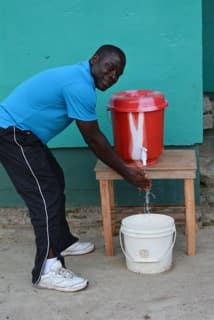 Easier said than done. Most homes in Liberia do not have proper sanitation. So Flomo is raising money to buy plastic buckets. One for every household in Liberia, he hopes. The bucket holds a solution of water and bleach, and has a faucet at the bottom.