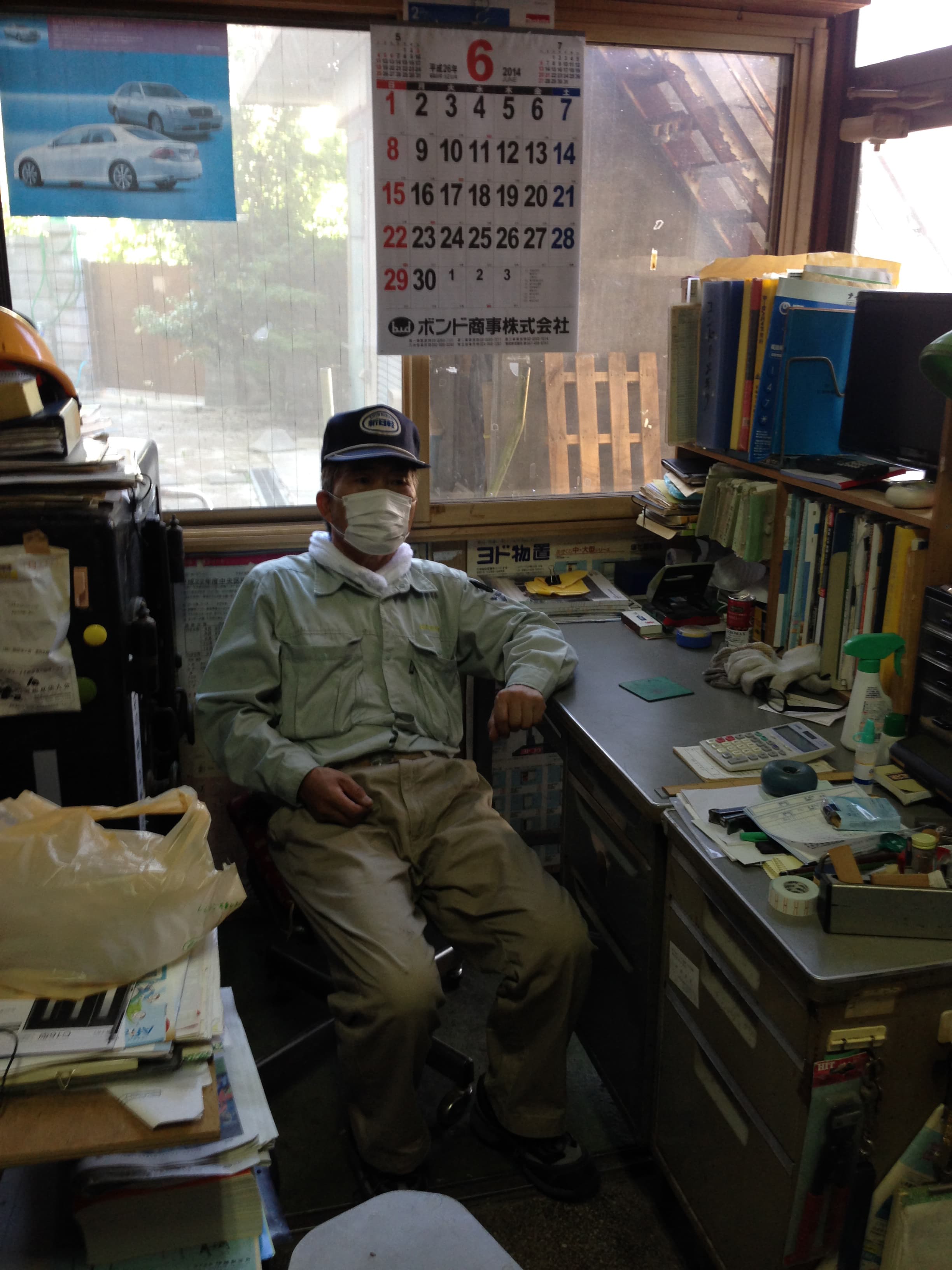 There is one man in the back, though: Shizuo Suzuki, the owner. He’s sitting at a cluttered desk, wearing a button-down shirt, a towel around his neck and a white paper mask. It's for the radiation, he says.