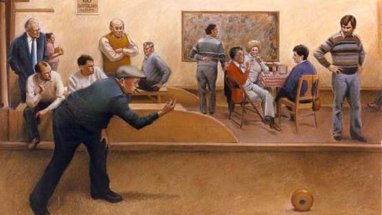 “I discovered featherbowling at my mother’s wake, which was right here in this room," he explains. "She was visiting relatives in Belgium when she suddenly and surprisingly died there. And while I was here, I peeked through the door and some of these old men were playing this strange game that I had never seen before.”