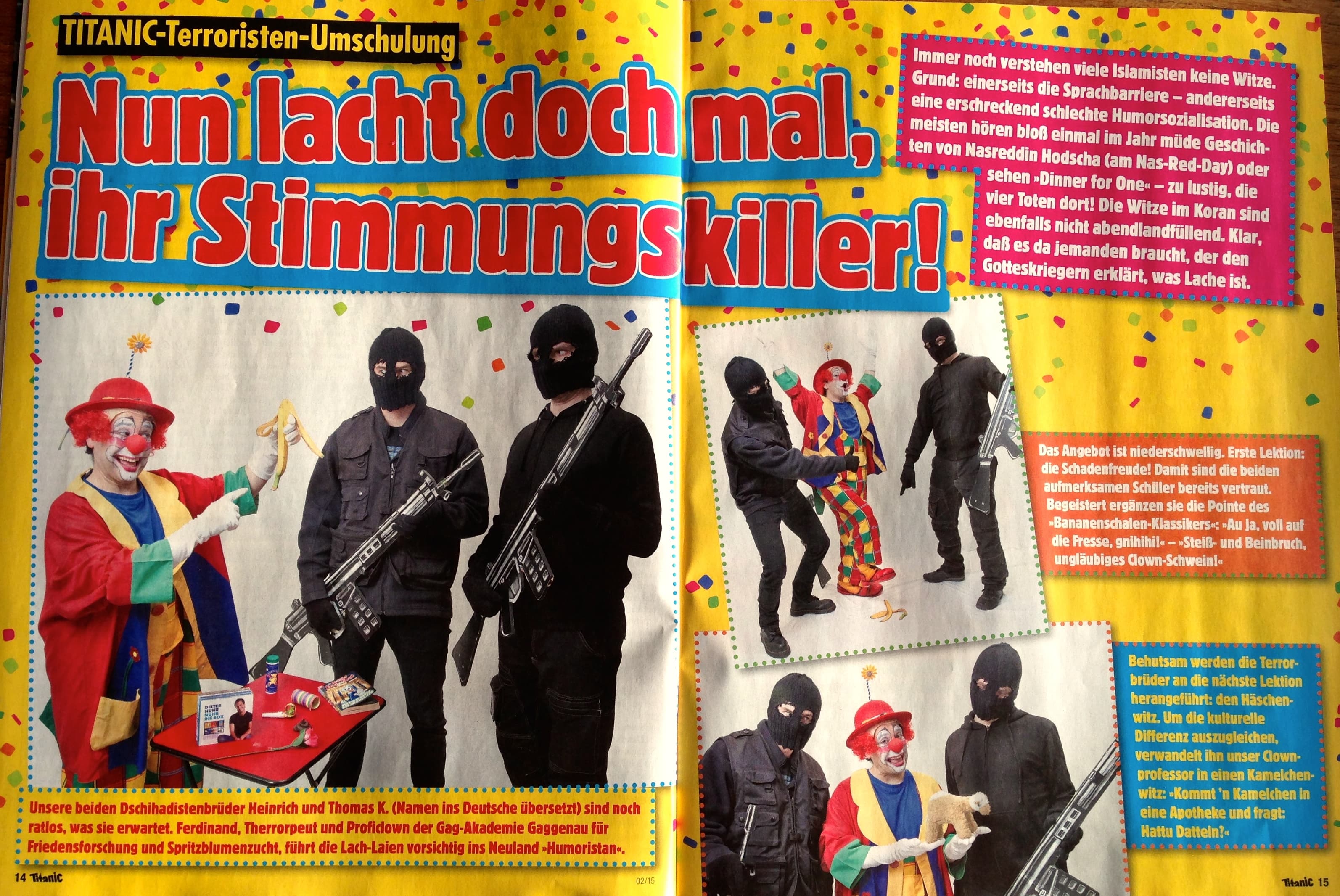 Inside, there are numerous jokes that take dead aim at Islamic extremists. One farcical piece describes a new “Terrorist re-education program” run by a clown who helps radicals learn to stop being such “mood killers.”