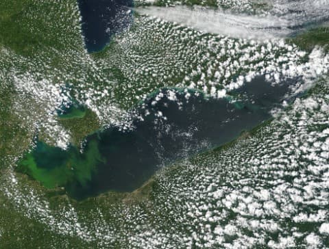The green signifies blue-green algae (which are technically photosynthetic bacteria). In great abundance, they can wreak havoc on lake ecosystems. Harmful algal bloom, or HAB, crops up in the Great Lakes annually around this time, and for Lake Erie, pictured, this year is lining up to be one of the worst that Davis has seen in a decade.