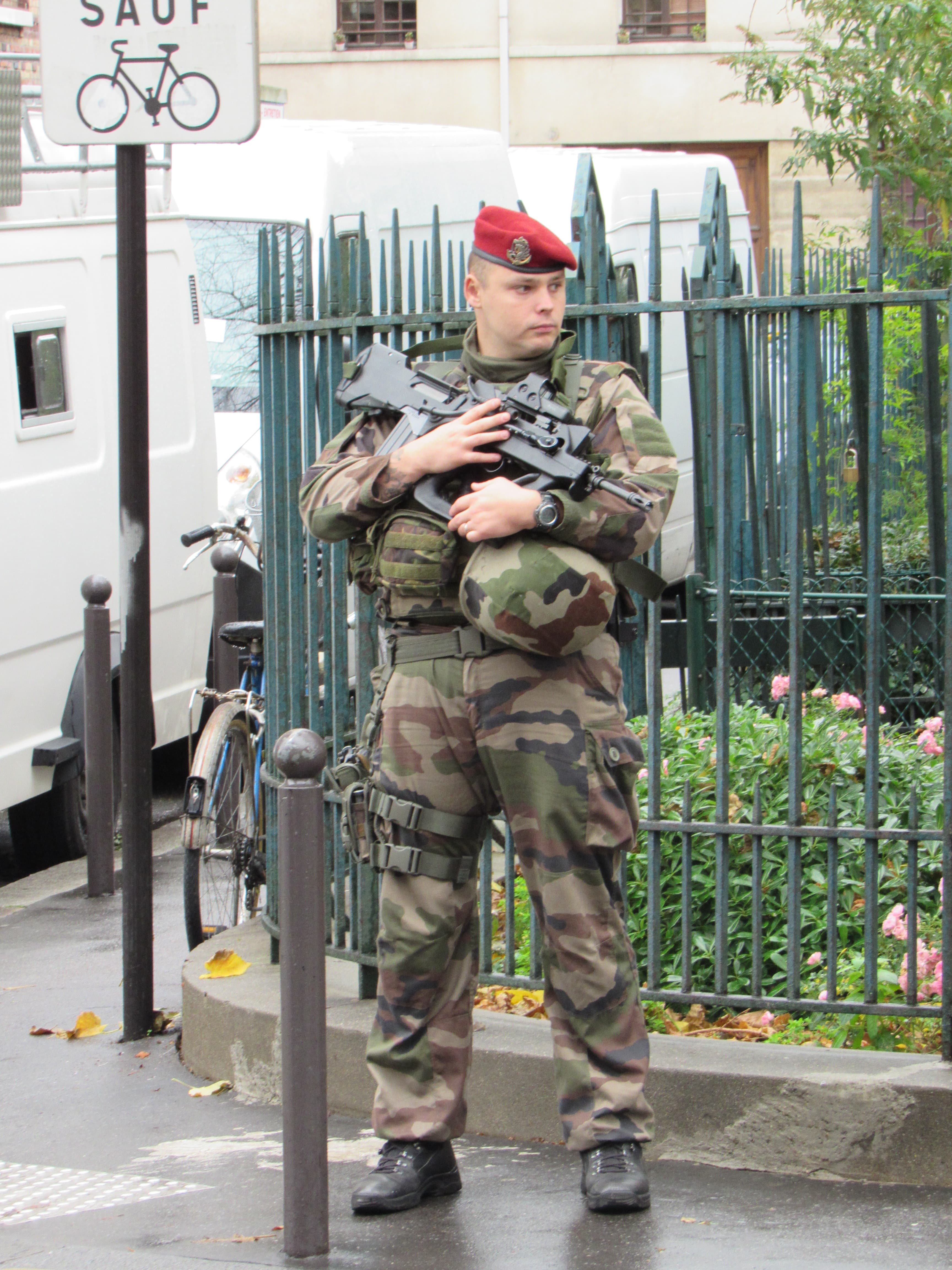 The Great Mosque in Paris is guarded by soldiers in fatigues, armed with machine guns, though there’s only a sporadic bag check at the front door. Inside, the building looks like a traditional Moroccan mosque, with colorful tiles and a tranquil patio populated with cypress trees. You’d never know that people here are on edge.