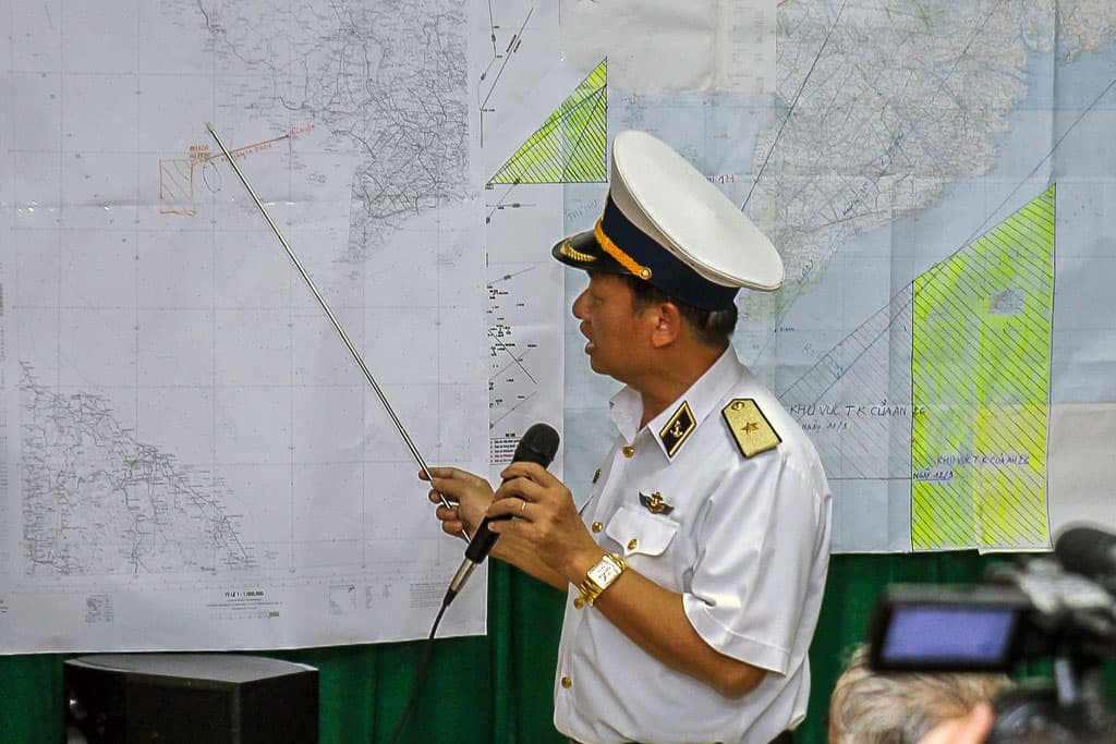 Vietnamese Navy’s Deputy Commander Rear Admiral Le Minh Thanh (R) points at a map to show the area where Vietnam is conducting search activities for the missing Malaysia Airlines flight 370 in Phu Quoc island on March 12, 2014.