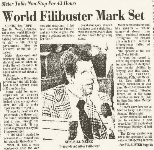 Sen. Strom Thurmond may hold the record for the US Senate, but Bill Meier, a former democratic Texas state senator, set the record for world's longest filibuster in 1977 after speaking for more than 44 hours. He was protesting a worker's compensation bill that he believed would hurt Texas business. Meier represented District-10, the same district Davis now represents. Like Thurmond did in 1964, Meier switched parties to become a republican in 1981.