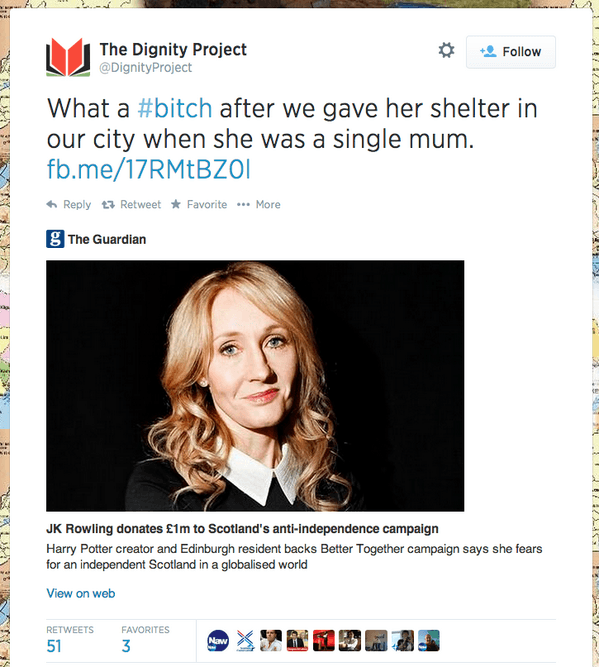 That’s been good enough for some independence supporters, who have been gracious if a little snarky ("As one of the world's leading fictional authors, I'm sure she can provide some good material for the no camp in the runup to September," said Yes Scotland board member Elaine C. Smith.) But someone at Edinburgh charity The Dignity Project was not at all pleased: