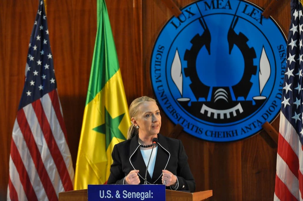 US Secretary of State Hillary Clinton spoke during a press conference at Dakar University in Senegal on August 1, 2012, as she began an 11-day trip in Africa focusing on peace, security and development.