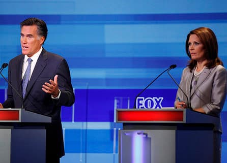 Republican presidential candidates former Massachusetts Gov. Mitt Romney and Rep. Michele Bachmann, R-Minn. during the Iowa GOP/Fox News Debate at the CY Stephens Auditorium in Ames, Iowa, Thursday, Aug. 11, 2011. (AP Photo/Charlie Neibergall (Pool/IowaPo