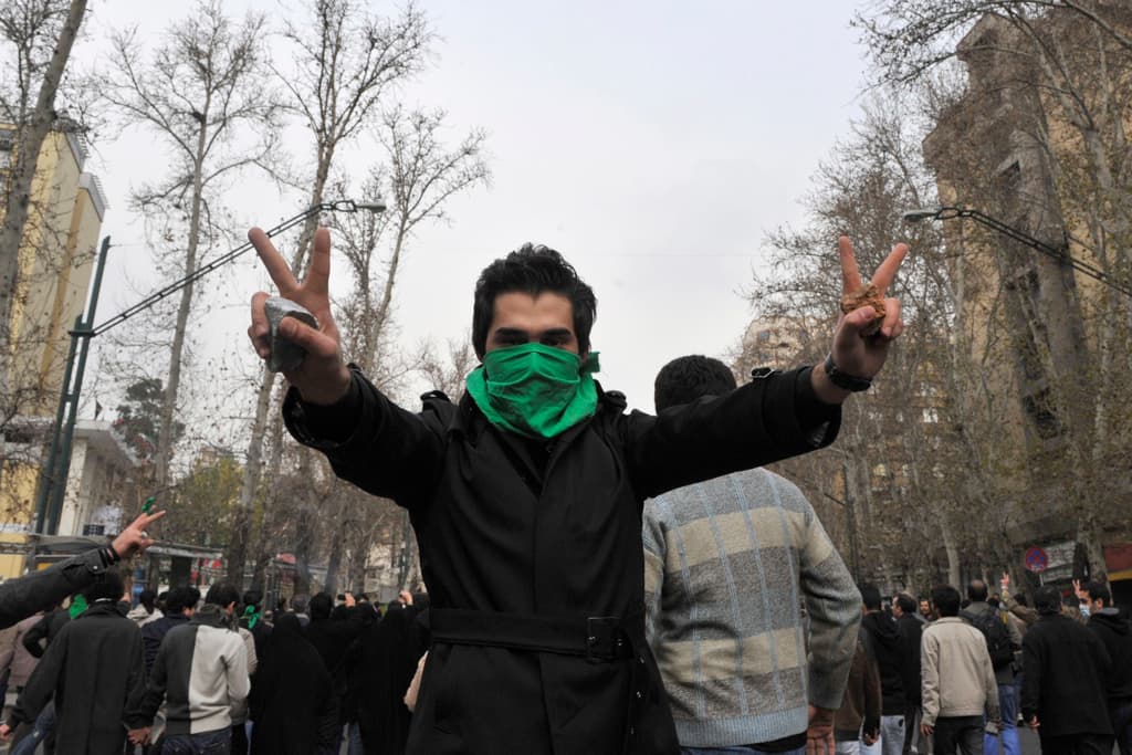 An Iranian protester with his face covered by a green mask flashes the victory sign as he holds stones during clashes in central Tehran Dec. 27, 2009. A senior Iranian police official denied a report on an opposition website that four pro-reform protesters were killed during clashes in Tehran on Sunday, the Students News Agency ISNA reported. (Reuters)