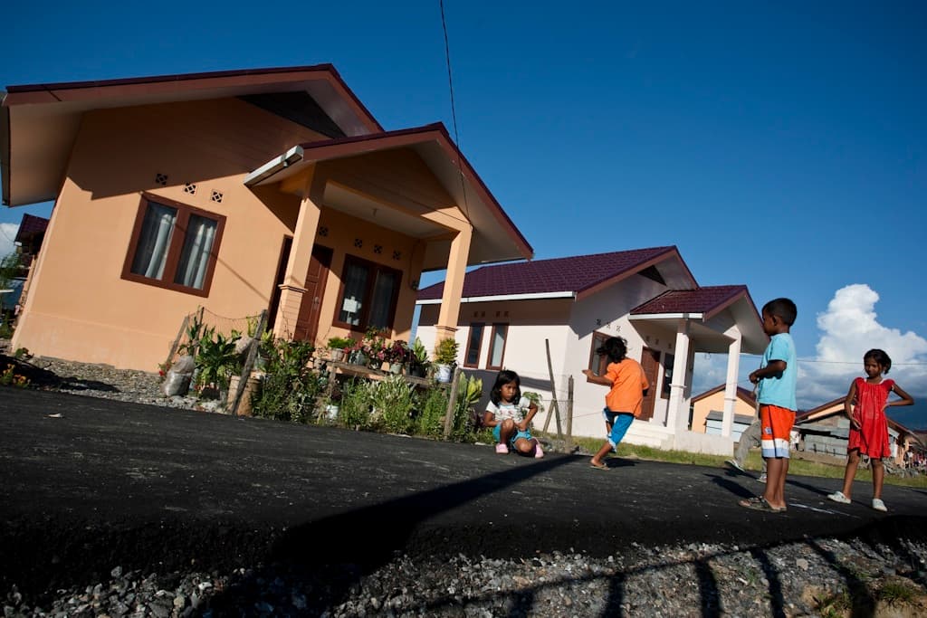 Children play in front of houses built by an aid organization for tsunami victims in Aceh Jaya, Indonesia. The 2004 tsunami destroyed hundred of thousands of houses. Aid groups and government organizations have rebuilt 140,000 houses.