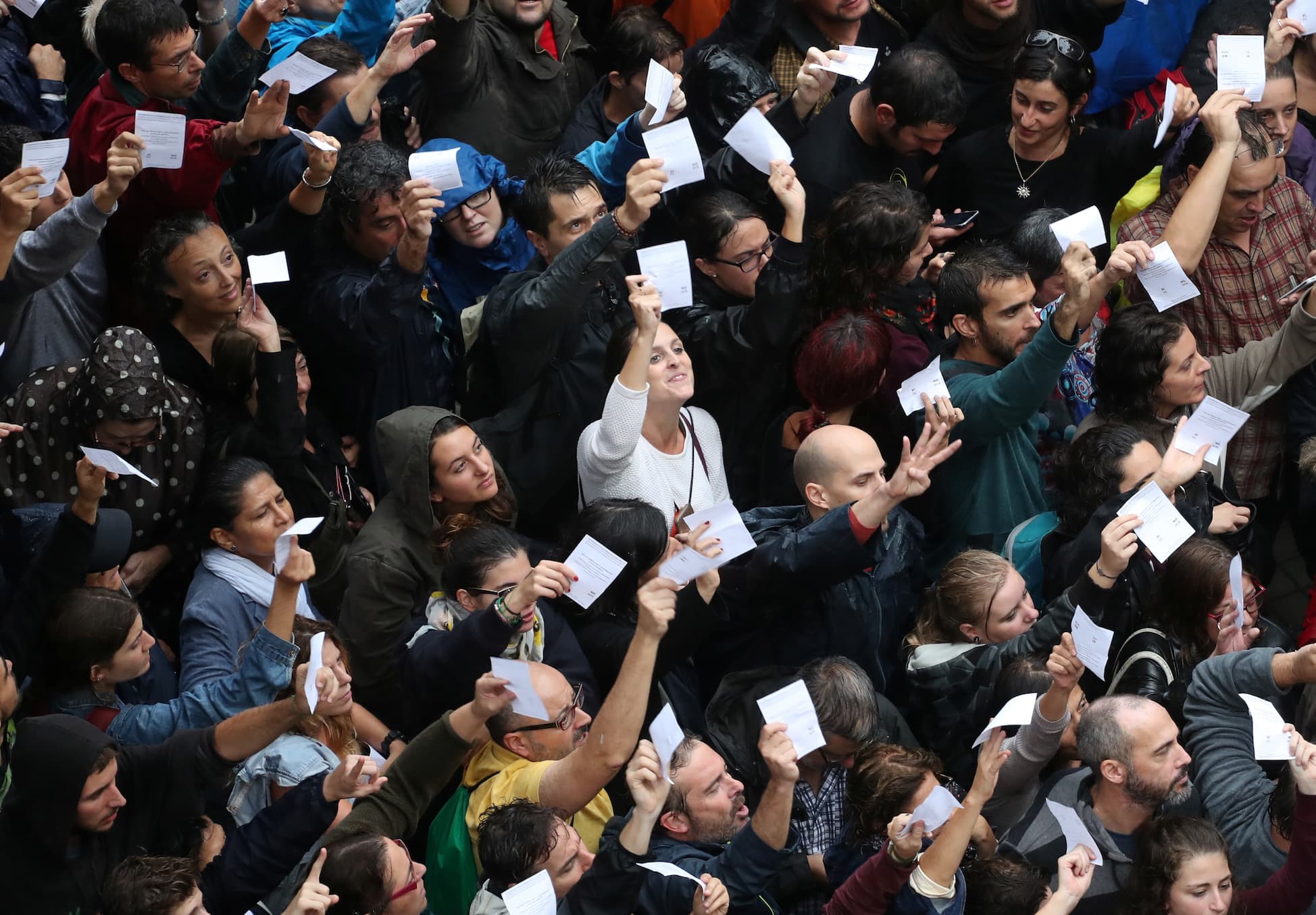 Under a sea of umbrellas outside a school in Barcelona, a crowd gathered, among them elderly people in wheelchairs, families with buggies and parents clutching toddlers by the hand. With no police in sight, they were able to cast their ballots, prompting scenes of jubilation.