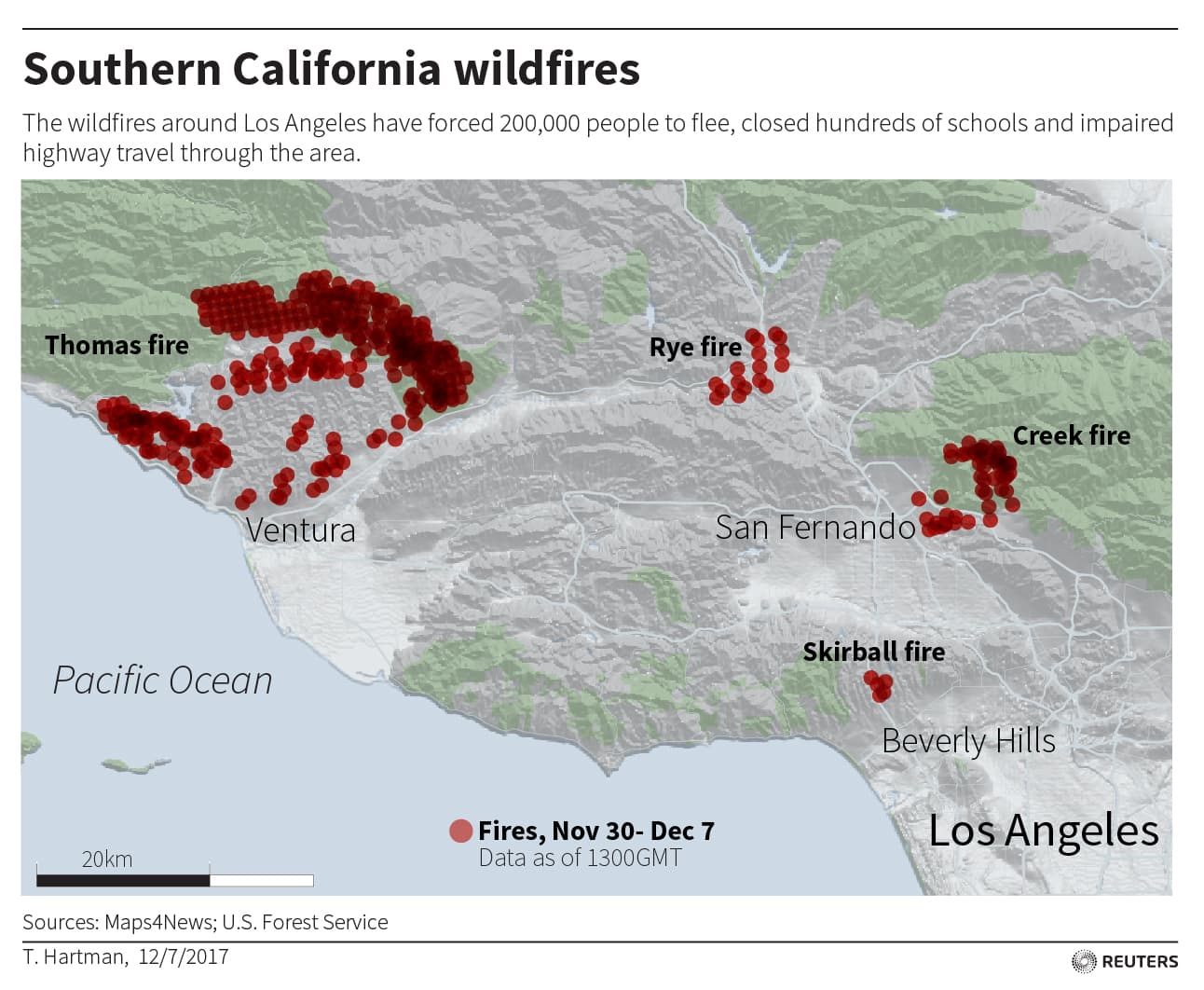 California governor Jerry Brown on Saturday will meet with residents affected by the fires and tour the wildfire damage in Ventura County northwest of Los Angeles, where the largest of the blazes, the Thomas Fire has charred 143,000 acres (57,870 hectares) and destroyed 476 structures.