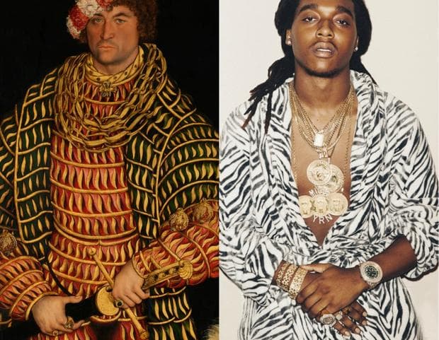 So do hip hop stars take their wardrobe cues from the wealthy subjects of medieval painters? Doubtful. But the images in B4XVI do make you wonder if there’s continuity across centuries, continents, and genres in the way we display power and influence — what Azcarate calls the “iconography of power.” Some of these comparisons seem as simple as accessories; furs and gold chains are pretty unmistakable symbols of wealth. But for Azcarate, the connections go even deeper: she’s trying to figure out whether there is a timeless representation of swag.