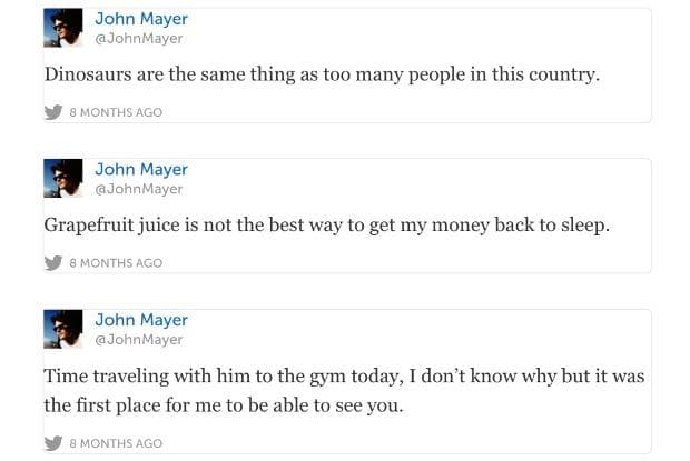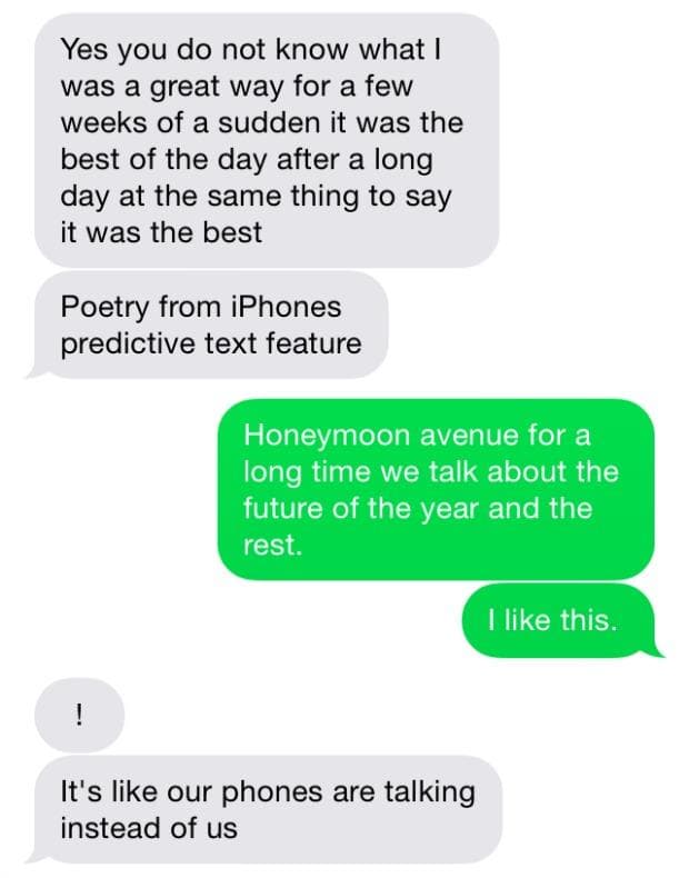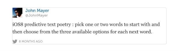 Headover to the internet to find countless Tumblrand Twitter accounts devoted to the art form. And don’t missJohn Mayer’s tweets from September 25th, 2014. He took a very deep dive down the predictive text poetry rabbit hole.