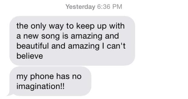 Is predictive text poetry gimmicky? Sure. Lazy? Probably.But in a time when Candy Crush is king, predictive text poetryoffersa smartphonediversion that’s a little more creative, with aremarkably high payoff to effort ratio. It’sversatile, quippy, random — everything the internet loves. Before you swipe left, think of taking 20 seconds of your day to compose a poem. You can tweet it at us @sideshow.