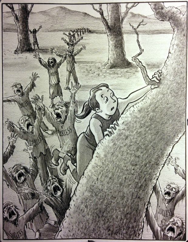 Several artists have interpreted Bechdel’s figureas a girl in distress, fighting against inner demons. From strivingto access creativity, to warding off fears of success, the landscape she fights is not topographical but emotional. Here are some of our favorite entries on that theme:
