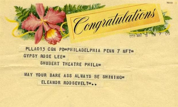 The New York Public Library is digitizing its Billy Rose Theatre Division Archive. Thatmeans a whole world of ephemera, whichwasn’t on the internet before, now is. The website Open Culture started sifting through it all and uncovered some gemsincluding portraits of Katherine Hepburn, costume sketches and, best of all, a telegramEleanor Roosevelt sent the burlesque dancer Gypsy Rose Lee on what must have been one incredible opening night.