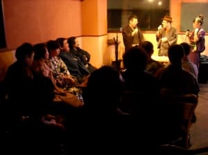 Last night Roland brought me along to his friend’s kimono Party. Yes, you guessed it, a kimono party is a party with people dressed in kimonos. Of course it was somewhat tongue in cheek, but as most Japanese these people were dead serious about their hobby. There was a one hour presentation on ways to modernize your kimono, like a 100-yen attachment to carry your cell phone in your obi (kimono belt) or a turtleneck undershirt to keep warm in winter. These things aren’t cheap either; $2000 is about average for a good kimono. And how else to finish the evening but with a kimono striptease?