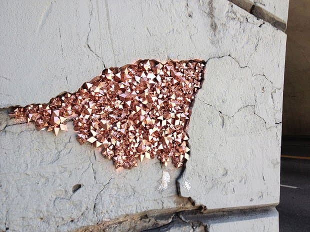 Crystal formations have been popping out of the cracks and crevices in the Los Angeles streetscape. They’re all the work of one mad paper-folding genius.